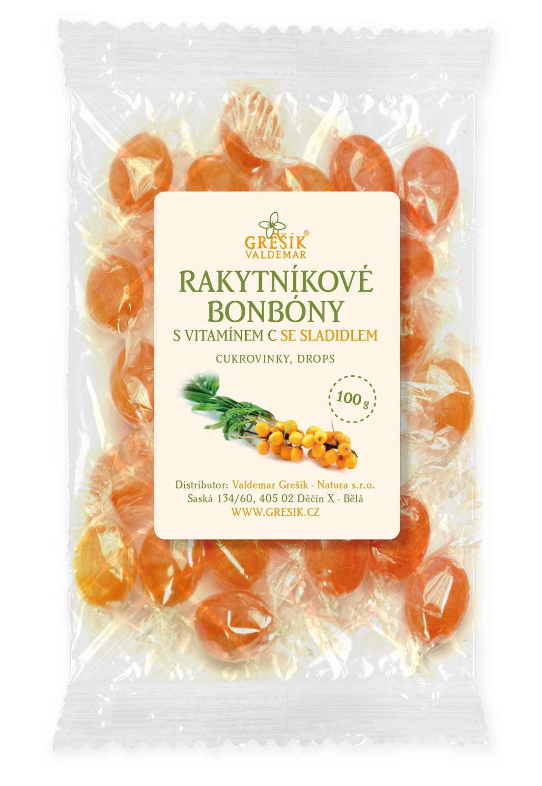 Osvěžující bonbóny s dužinou rakytníku, obsahují přidaný vitamín C.