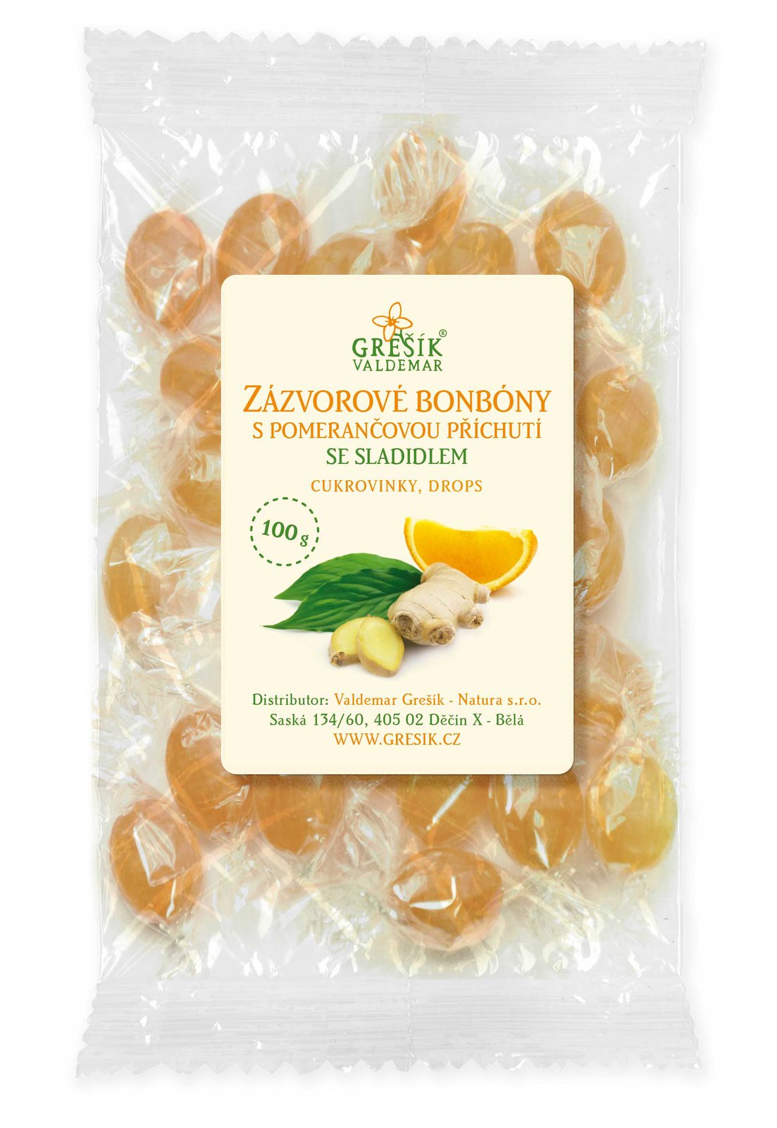 Složení: sladidlo: isomalt, regulátor kyselosti: kyselina citrónová, přírodní aroma (zázvorový extrakt 0,25 %, pomerančová silice), koncentráty (jablko, citrón, světlice barvířská)